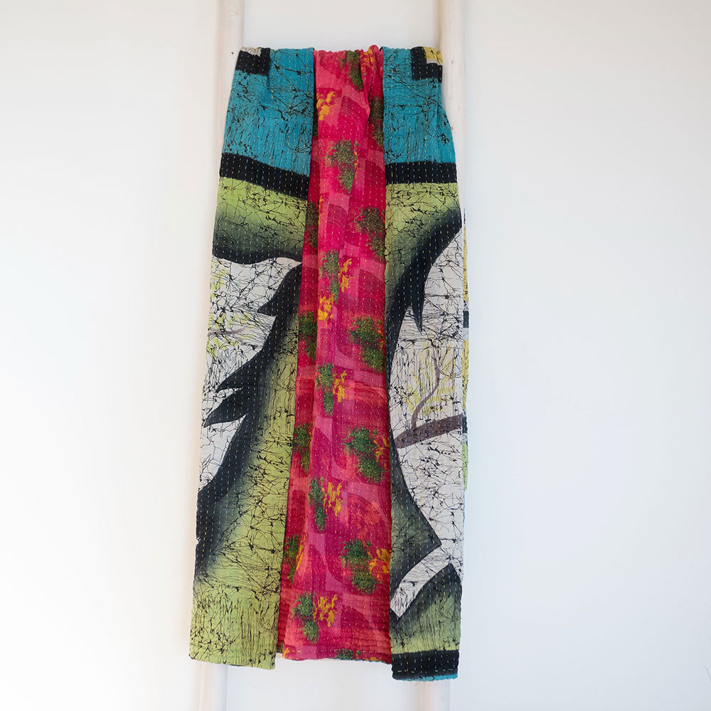 Hand-sewn Kantha quilt is crafted by artisans in Calcutta, India. Each yard of sari material used for the blanket has been purchased from impoverished areas of Calcutta. The vintage sari material is then stitched together with colorful thread to create these beautiful, softly layered cotton throws.